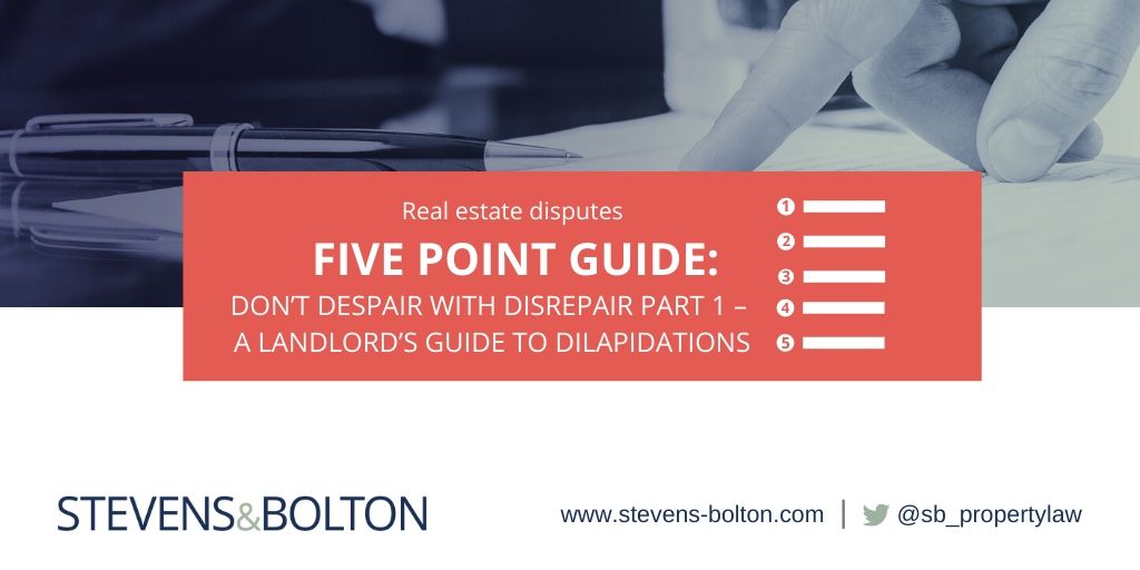 Dilapidations is a complicated area of law and you should always seek specialist advice. If you would like further information, please contact a member of the real estate disputes team at Stevens & Bolton.